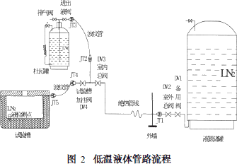 3、液氮管路流程。液氮管路流程用于向試驗(yàn)裝置加注低溫液體冷卻劑液氮,其流程如圖2所示。