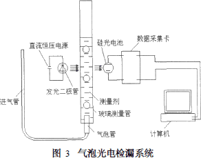 測試系統(tǒng)的臺架總體結(jié)構(gòu),包括儀表面板(垂直面)、閥門面板(傾斜面)、儀器架和氣泡光電檢漏系統(tǒng)等部分。儀表面板上包含電源開關(guān)/指示器、指針式精密壓力表、數(shù)字式壓力表、溫度數(shù)顯儀和試驗(yàn)時間計時器等。氣泡光電檢漏系統(tǒng)的原理性示意圖如圖3所示。