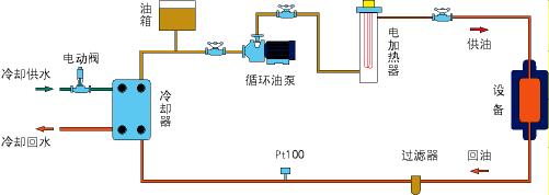 導熱油溫控裝置是由循環(huán)油泵、電加熱器、冷卻器、冷卻閥(或風機)、溫度傳感器、油箱、閥組及控制柜構(gòu)成。溫控裝置特別適合于高溫冷卻需求(冰點以下),該裝置經(jīng)常是以加熱為主,冷卻為輔。