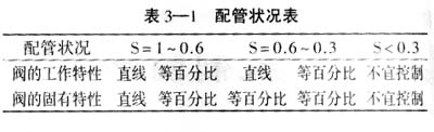 調(diào)節(jié)閥總是與管道、設(shè)備連在一起使用的,管道阻力的存在必然會(huì)使閥的工作特性與固有特性不同。所以,應(yīng)根據(jù)對(duì)象的特性,選擇合適的工作特性,再根據(jù)配管情況選擇相應(yīng)閥的固有流量特性?紤]工藝配管情況時(shí),可參照表3-1來(lái)選擇閥的固有特性。
