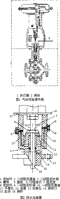 根據(jù)分析,在閥門執(zhí)行機(jī)構(gòu)上增設(shè)一個(gè)阻尼機(jī)構(gòu),使之在接近關(guān)閉行程的最后20%范圍內(nèi)發(fā)揮作用,讓閥門分程緩關(guān)閉。也就是說,在關(guān)閥行程的0~80%范圍內(nèi),此阻尼機(jī)構(gòu)不起作用,以保證閥門有良好的動(dòng)作靈敏性,而在最后的20%關(guān)閥行程中分為2級阻尼,使之越到接近全關(guān)的位置,阻尼越強(qiáng)烈,消除了流速瞬變造成的水擊危害根源,其中2級阻尼的強(qiáng)度可以用針閥調(diào)節(jié),便于根據(jù)不同的閥門和過程對象,選擇最佳阻尼,達(dá)到防水擊的最好效果。