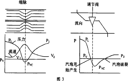 眾所周知,液體介質(zhì)在高壓差下會(huì)產(chǎn)生空化。研究表明,空化產(chǎn)生于液態(tài)區(qū)的汽泡,生成汽泡的必要條件是液態(tài)所處的絕對(duì)壓力低于該液體飽和蒸汽壓力Pv。如圖3所示,閥座相當(dāng)于節(jié)流孔板,高壓流體流經(jīng)節(jié)流孔時(shí),靜壓能與動(dòng)壓能相互轉(zhuǎn)換,流速的增加導(dǎo)致壓力降低。當(dāng)壓力降低至等于或低于該流體在入口溫度下的汽化壓力Pv時(shí),液體中的蒸發(fā)膨脹而形成汽泡,帶有氣泡的液體在寬敞的下游流道中流速下降,壓力回升。當(dāng)壓力回升至Pv或高于Pv時(shí),汽泡潰裂,這即是空化過(guò)程。汽泡潰裂時(shí),釋放出巨人的能量,對(duì)閥座、閥芯等節(jié)流元件產(chǎn)生破壞,即空蝕?栈钠茐牧艽,據(jù)測(cè)算,汽泡破裂的瞬時(shí)壓力高達(dá)300MPa,現(xiàn)有的工程材料難以抵抗其空蝕。對(duì)于不銹鋼等塑性材料,在空化作用,將產(chǎn)生麻點(diǎn)腐蝕起碼到呈蜂窩狀空洞損壞;而對(duì)于硬質(zhì)合金等脆性材料則產(chǎn)生碎塊損壞。