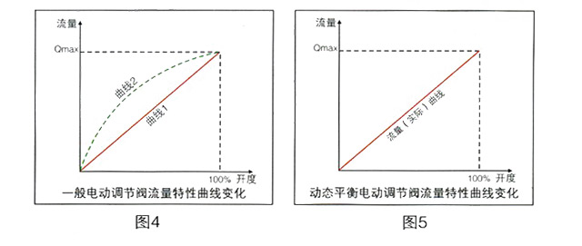 動(dòng)態(tài)平衡電動(dòng)調(diào)節(jié)閥由于獨(dú)特的閥體結(jié)構(gòu),在實(shí)際的使用工作中閥權(quán)度基本為1,因此其實(shí)際的流量特性曲線與理想的流量特性曲線一致(如圖5),沒(méi)有偏離,因此具有優(yōu)良的電動(dòng)調(diào)節(jié)功能。