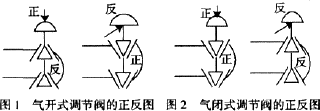 。2)氣閉式調(diào)節(jié)閥。圖2為氣閉式調(diào)節(jié)閥的正反圖,當閥門定位器給調(diào)節(jié)閥膜頭發(fā)送關(guān)閥的壓力信號時,如果閥桿太短,閥芯向下(或向上)移動距離不夠,造成閥芯和閥座之間有間隙,而不能充分接觸,導致調(diào)節(jié)閥關(guān)不嚴而有漏。同樣,如果閥桿太長,閥桿向上(或向下)移動距離不夠,而不能充分打開閥芯導致調(diào)節(jié)流量太小。