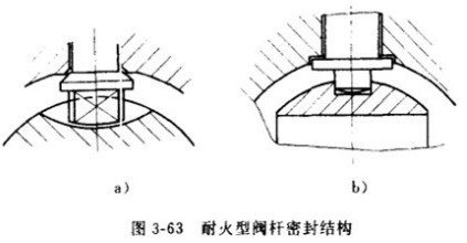 3-63為耐火型閥桿密封結(jié)構(gòu);一旦失火,軟質(zhì)填料被燒毀或軟化,閥體體腔內(nèi)的流體壓力將閥桿推向閥體閥桿上的臺肩被閥體擋住,并藉高壓流體壓力作用壓緊而密封;此外,它還能防止腔內(nèi)異常升壓時(shí)閥桿沖出體外。