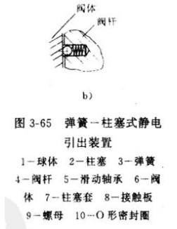 圖3-65a所示為彈簧一柱塞式靜電引出裝置。壓縮彈簧加載于柱塞,使球體與閥桿以及閥桿與閥體之間形成靜電通道。這樣,因摩擦產(chǎn)生的靜電便通過彈簧一柱塞傳到閥桿和閥體,從而通過管道與地接通,達(dá)到消除靜電積累之目的。