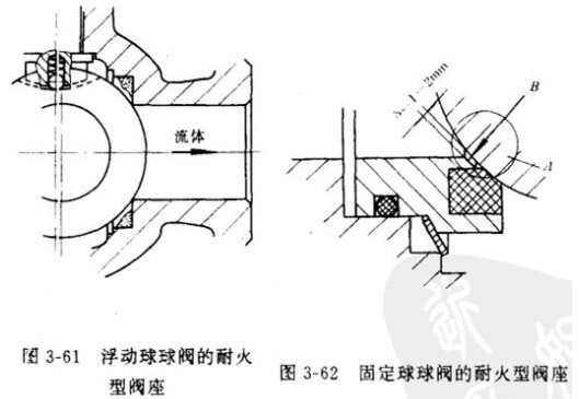 3-61為浮動(dòng)球球閥的耐火型閥座密封結(jié)構(gòu)。一旦失火,其高分子材料閥座被燒毀,球閥的球體在流體壓力作用下,就會向閥后閥座方向推進(jìn),使之與加工成直角的閥體閥座槽金屬座面接觸。起到臨時(shí)和部分密封作用.避免災(zāi)情進(jìn)一步擴(kuò)大。